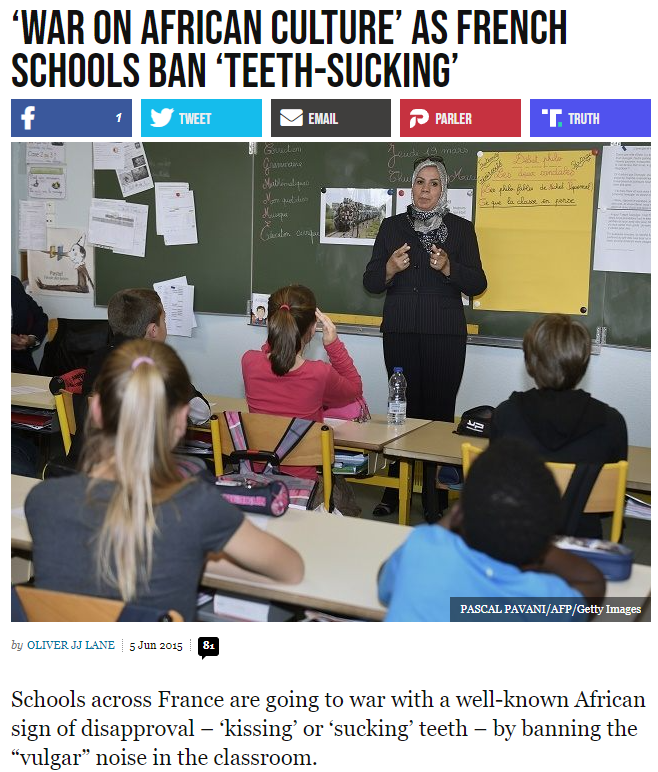 About four years ago, the gesture drew attention when a few French schools decided to ban its use. Let me say that children sucking teeth at adults is an act of defiance; use of the gesture with a teacher would be rude. However, some saw this interdiction as unjust and unduly harsh towards Black students. Others considered it an appropriate way to promote the type of language expected in formal settings.